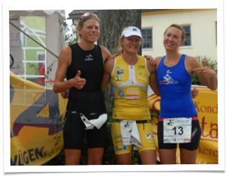 Ich wusste, dass dieser Bewerb auf Grund der schwierigen Radstrecke und auch Laufstrecke nicht übers Schwimmen gewonnen wird. Meine größten Konkurrentinnen sah ich in Renate Forstner aus Deutschland, die eine tolle Schwimmerin ist und Barbara Tesar aus der Steiermark. So war es auch nicht unerwartet für mich, als Renate Forstner weit vor allen anderen Damen aufs Rad wechselte. Ich stieg kurz nach Barbara Tesar als dritte aus dem Wasser und vernahm noch vom Sprecher die Nachricht, dass Renate mit 6 min 30 sec Vorsprung auf die Radstrecke gegangen ist. Barbara Tesar sah ich noch kurz in der Wechselzone. So jetzt hieß es Zeit am Rad gut zu machen. Schon bald sah ich Barbara Tesar vor mir und konnte sie gegen Ende der ersten Runde überholen, doch sie ließ sich nicht abschütteln. Als wir dann am Zielbereich vorbeifuhren und in die zweite Runde gingen, konnten wir vom Sprecher noch erfahren , dass wir schon einige Zeit auf Renate gut gemacht hatten. Jetzt hieß es dran bleiben und siehe da, kurz bevor ich in die dritte und somit letzte Radrunde ging konnte ich auch Renate Forstner überholen, jetzt waren wir alle drei knapp beisammen und es brauchte doch einiges an Kraftanstrengung um die beiden etwas abzuschütteln, doch nach einigen Kilometern waren sie außer Sichtweite. Die hügelige Strecke machte sich dann natürlich in der dritten Runde schon sehr bemerkbar, aber ich wollte schauen beim Laufen einen gewissen Zeitpolster zu haben. So wechselte ich mit einem Vorsprung von 1 min 15 sec auf Barbara Tesar als Führende auf die hügelige, sehr anspruchsvolle Laufstrecke. Die schwierige Radstrecke und natürlich auch die Aufholjagd auf Renate Forstner hatte ihre Spuren hinterlassen und so kam ich nur schwer in einen guten Laufrhythmus und mein Vorsprung verkleinerte sich. Barbara Tesar war mir dicht auf den Fersen und so konnte sie mich in der zweiten Runde sogar überholen und ich konnte sie nicht halten, versuchte aber den Abstand nicht größer werden zu lassen, noch waren wir nicht im Ziel. Kurz bevor wir auf die dritte Runde gingen, verkleinerte sich der Abstand wieder und als wir im Zielbereich durchliefen war ich ihr bereits dicht auf den Fersen, ich konnte sie dann in der dritten Runde wieder überholen, ich ging an ihr vorbei und zog das Tempo etwas an, anfangs versuchte sie natürlich das Tempo mitzugehen, doch dann konnte ich den Vorsprung wieder ausbauen und durchlief den Zielbereich wieder als Führende, nun hieß es dieses Tempo auf der vierten Runde durchzulaufen um den Sieg nach Hause zu bringen. Dies gelang mir auch und ich lief mit einer Gesamtzeit von 4:57 als Siegerin des WEM Litschau und Landesmeisterin über die Halbdistanzüber über die Ziellinie, mit einem Vorsprung von einer Minute. Dies gibt mir viel Zuversicht und Kraft für die Staatsmeisterschaften über die Langdistanz in zwei Wochen in Podersdorf.